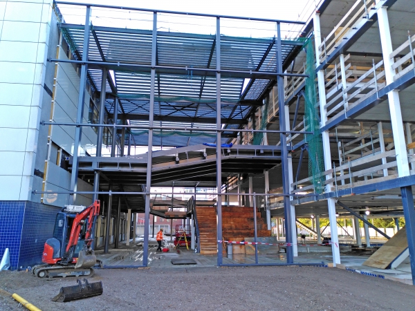 De nieuwbouw van het onderwijsgebouw Techplaza op de onderwijscampus van RijnIJssel nadert het hoogste punt. De centrale wokkeltrap, de verbinding tussen oud en nieuw is al duidelijk herkenbaar. Het gebouw techplaza wordt het nieuwe gebouw voor het techniek-, laboratorium- en ICT onderwijs van Rijn IJssel. Het gebouw staat op de Velpercampus, het Rijn IJssel campusterrein wat momenteel wordt ontwikkeld op het voormalige Akzoterrein aan de Velperweg in Arnhem.